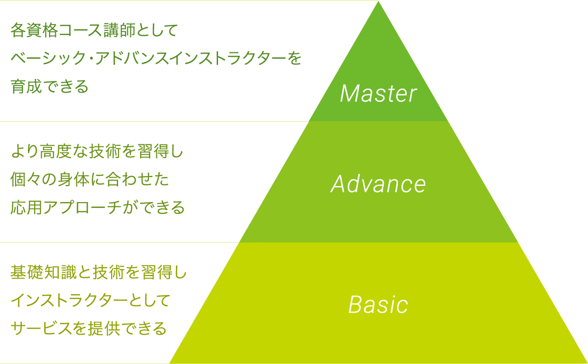 ボディメンテナンスに関するトレーナー・セラピストになるための専門資格です。インストラクターとしてサービスを提供できる「Basic」の取得後、上位資格となる「Advance」やインストラクターを育成できる「Master」を目指すことができます。