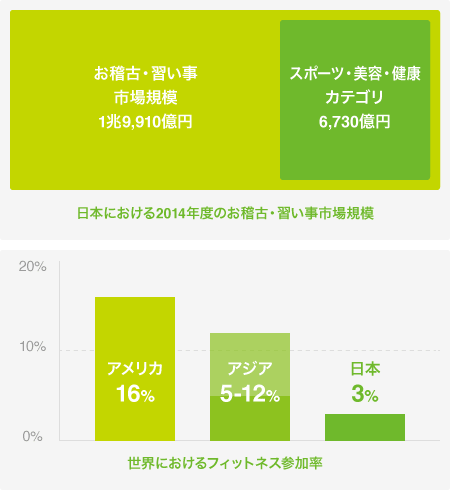 日本における2014年度のお稽古・習い事市場規模は、1兆9,910億円と推計され、うちスポーツ・美容・健康カテゴリでは6,730億円となっています。特に、美容・ダイエットなどのコンプレックス産業の市場は大きく、フィットネス市場の売上高は4,316億円、施設数は4,375軒、会員数は4,193,706人、参加率は3.3%と推定され、業界史上最高の市場規模となりました。(クラブビジネスジャパン調べ)しかし、過去最大となった市場規模においても、アメリカのフィットネス参加率は16%、アジア5〜12%、日本3%とも言われ、世界の中でアジアのフィットネス参加率は低水準です。例えばヨガ人口に関しても、2014年における日本のヨガ人口は100万人程度ですが、アメリカのヨガ人口は2000万人と20倍の差があります。人口の差(日本=1.2億人、アメリカ=3.4億人)を考慮しても、人口あたりの参加率は低いのです。